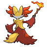 Delphox is a bipedal, fox-like Pokémon with an appearance that evokes the image of a mystical sage or wizard. Its body is covered in a distinctive coat of long fur that resembles a flowing robe, predominantly dark red with red-orange, flame-like markings near its knees. A thin tuft of white fur adorns its torso, flanked by yellow fur draping down from its shoulders like ceremonial garments. The creature's forearms feature long red fur that extends like sleeves, while its hands and feet are dark gray with three clawed digits each. Its tail, covered in yellow fur, protrudes from beneath its robe-like coat. The head is predominantly yellow with longer white fur on its cheeks, red eyes, and a slender snout with a pinkish nose, with three tufts of red-orange fur protruding from each ear. Most notably, Delphox carries a wooden branch or stick that it uses like a magical wand—when not in use, the stick is concealed within its sleeve-like fur, and when activated, the tip ignites with flame.