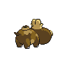 Hippopotas is a quadrupedal Pokémon with a bulbous, hippopotamus-like body structure that reflects its real-world inspiration. The Pokémon exhibits distinct sexual dimorphism in coloration: males display a tan base color with mottled dark brown patches, while females present this color scheme inverted. Its most prominent feature is a large snout equipped with round, protruding nostrils and several blunt teeth visible within its mouth, designed for its unique feeding mechanism of ingesting sand along with prey. The creature possesses small, rounded ears and eyes that protrude from the top of its head, providing awareness of its desert surroundings despite its tendency to remain buried. Each of its four feet is equipped with two blunt claws suitable for traversing sandy terrain, and it sports a diminutive tail relative to its body size. A distinctive small hole located on its back serves as an additional outlet for expelling sand, complementing the primary function of its nostrils. Unlike biological hippopotamuses that regulate body temperature through water immersion, Hippopotas has adapted to arid desert life by expelling sand from its body in place of perspiration, a remarkable physiological adaptation that allows it to thrive in environments where water is scarce.