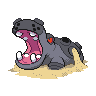Hippowdon's anatomy reflects its harsh desert environment and aggressive nature, featuring a massive frame reinforced with thick, protective skin that varies in coloration by gender—males display a light brown hue while females present a bluish-gray tone, both topped with darker gray backs and muzzles. The most striking feature is its enormous mouth, which opens to nearly seven feet across and contains powerful peg-like teeth, with two particularly pronounced fangs jutting from its lower jaw that enable it to crush vehicles with ease. Scattered across its back and snout are numerous small and large ports that serve as specialized sand-storage organs; Hippowdon uses these cavities to internally store vast quantities of sand, which it expels to create devastating sand twisters during combat. The Pokémon maintains its health by constantly cycling sand through these ports, and it has developed a beneficial symbiotic relationship with Dwebble, which clears stones that become lodged within the ports in exchange for shelter and protection. Its four powerful feet, each equipped with blunt, flat claws, provide the stability necessary to support its massive frame across desert terrain, while its red eyes reflect a temperament as intense as its physical form.