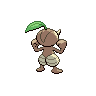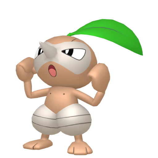 Nuzleaf is a bipedal plant Pokémon with a distinctly humanoid appearance dominated by earthy brown coloration and beige facial markings that resemble a mask. A single emerald-green leaf protrudes from the crown of its head, serving as both a defining visual characteristic and a functional instrument; notably, this leaf appears noticeably smaller on female specimens, providing a subtle but consistent gender dimorphism. The Pokémon possesses remarkably thin arms with mitten-like hands, bulky thighs accentuated by thin striations, and most distinctively, an elongated pointed nose that serves as both a sensory organ and critical vulnerability point. According to Pokédex documentation, gripping this long nose causes Nuzleaf to lose its power entirely, suggesting the nose functions as a crucial neural or magical nexus for the species. The creature's overall physiology demonstrates a clear botanical origin, with its body structure optimized for arboreal life despite its surprisingly grounded appearance. Its design suggests an evolutionary adaptation to forest environments, combining plant-like characteristics with surprisingly sophisticated motor control and intelligence.