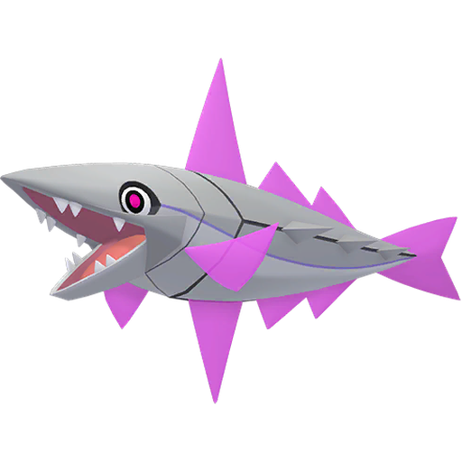 Veluza is a fishlike Pokémon with a distinctive gray body adorned with pointed, translucent bright magenta fins that serve as both visual markers and functional appendages for aquatic movement. Its most striking features are its piercing red eyes, which reflect its predatory nature, and the thin blue lines that run the length of its body from its eyes to its tail. The creature's mouth is characteristically open, revealing multiple sharp teeth designed for tearing flesh with surgical precision. Most remarkably, Veluza's fins extend internally throughout its body, with a sophisticated skeletal structure comprising rows of diamond-shaped spikes along either side of its central axis. Three of these spikes protrude visibly from its flesh, giving the creature an almost skeletal appearance. The creature possesses exceptional regenerative abilities, allowing it to grow back flesh that it deliberately sheds. When Veluza discards this unnecessary flesh through its signature move Fillet Away, its mind becomes honed and its psychic power increases substantially, while simultaneously boosting its physical agility and offensive capabilities. Interestingly, the discarded flesh has a mild yet delicious flavor, suggesting an ecological niche where even Veluza's waste products serve a purpose in the food chain.