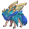 The design of Zacian's Crowned Sword form draws inspiration from legendary sword-wielding heroes across multiple mythological traditions, most notably the Arthurian legend of King Arthur and Excalibur. The name 'Zacian' itself likely derives from the word 'scion,' reflecting its role as a legendary heir to Galar's protective legacy, with the 'Z' prefix adding an exotic flair common to legendary Pokémon naming conventions. The sword aesthetic is unmistakable in this form, with the Pokémon's physical structure incorporating a blade-like weapon that emerges naturally from its body, representing the perfect fusion of wolf-like grace and martial weaponry. The cyan coloration with tan accents provides excellent contrast, making the Pokémon visually striking while the pink braids and fringes add an elegant, almost regal quality that elevates its appearance beyond that of a mere beast of war. The missing portion of its left ear serves as a design element that grounds the Pokémon's legendary status in authentic combat experience, suggesting scars earned through countless battles rather than battles yet to come. The overall aesthetic communicates nobility, power, and historical significance—a legendary warrior that has proven itself time and again as the guardian of an entire region.